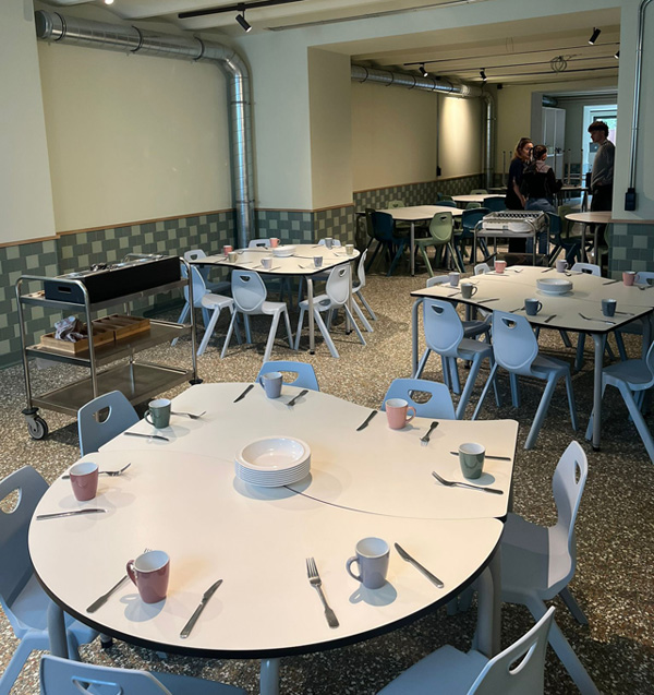 Les repas chauds et collations saines sont assurés pour tous les élèves par TCO, traiteur certifié Good Food. L’école est par ailleurs en cours d’obtention du label Good Food « cantine » de Bruxelles Environnement, qui distingue les établissements engagés pour une alimentation durable et la réduction du gaspillage alimentaire.